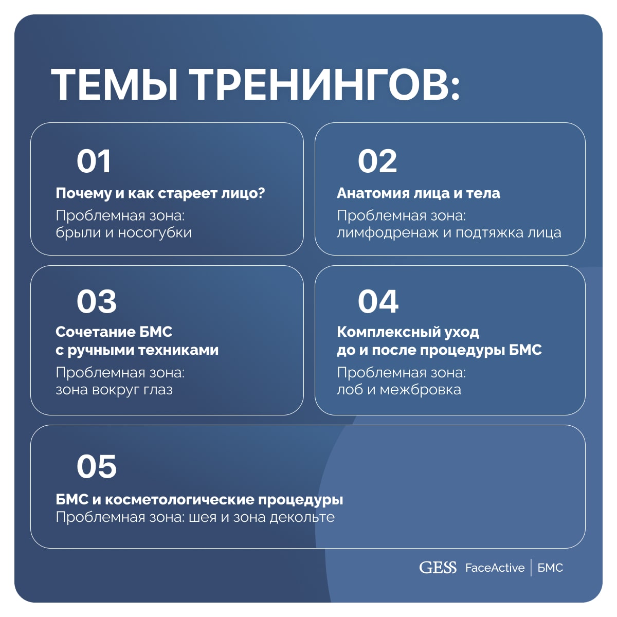Цикл из пяти тематических видеоуроков, в которых сочетаются практические демонстрации, теоретические пояснения и работа спикеров на личном примере. Программа разработана как для специалистов бьюти-сферы, так и для пользователей аппарата БМС FaceActive. Бессрочный персональный доступ позволяет изучать материалы в любое время через удобный интерфейс личного кабинета.